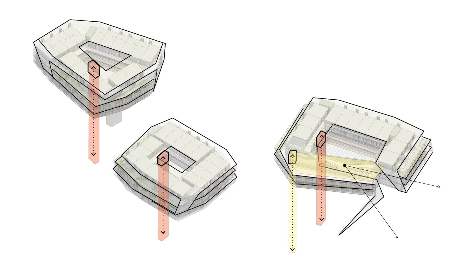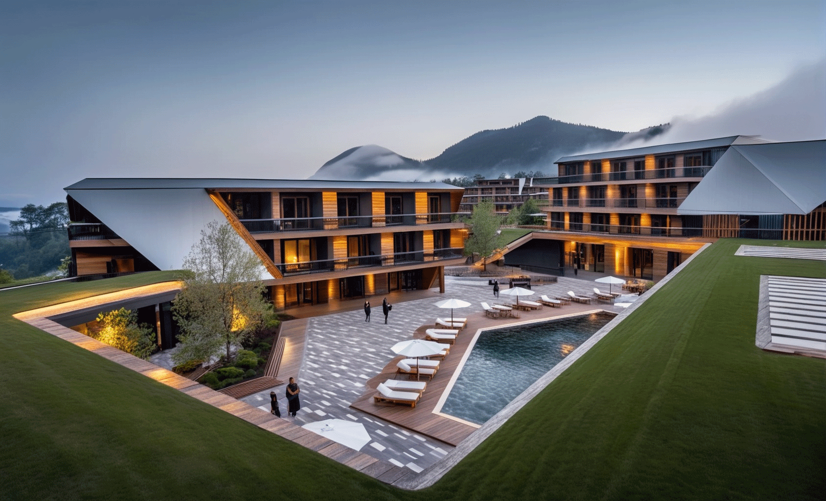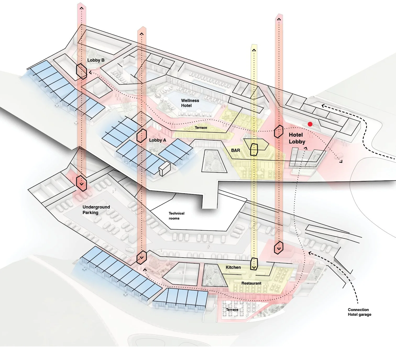 The hotel experience focuses on inviting communal spaces—such as the lobby, bar, restaurant, and atrium or light court—with wellness, sauna, and fitness services seamlessly integrated into the guest journey.