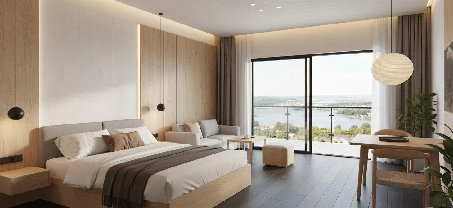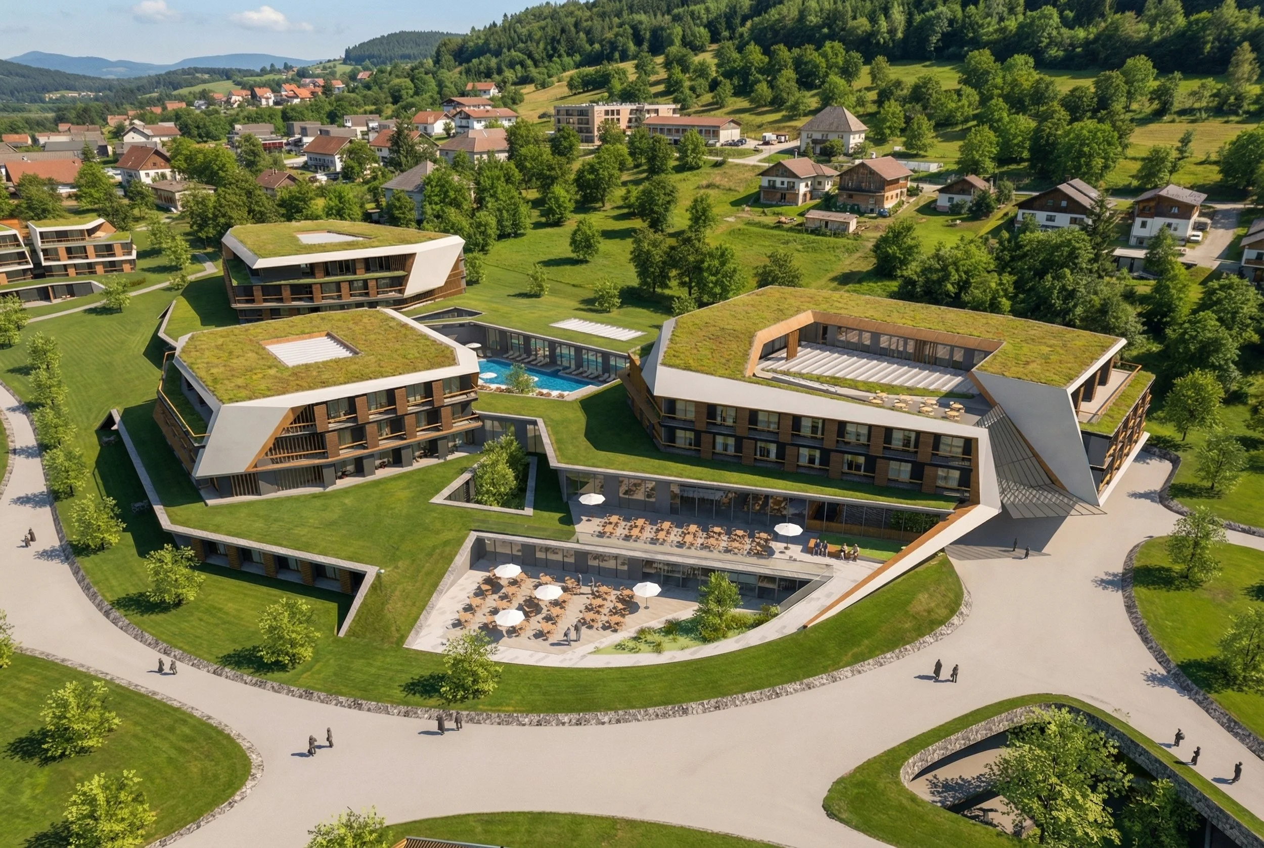 The 4-star superior hotel extends the resort into a year-round destination, pairing premium hospitality with direct access to the spa and the landscape. The concept combines a clear resort structure with warm, regionally rooted materiality—balancing contemporary comfort with the character of Carinthia.