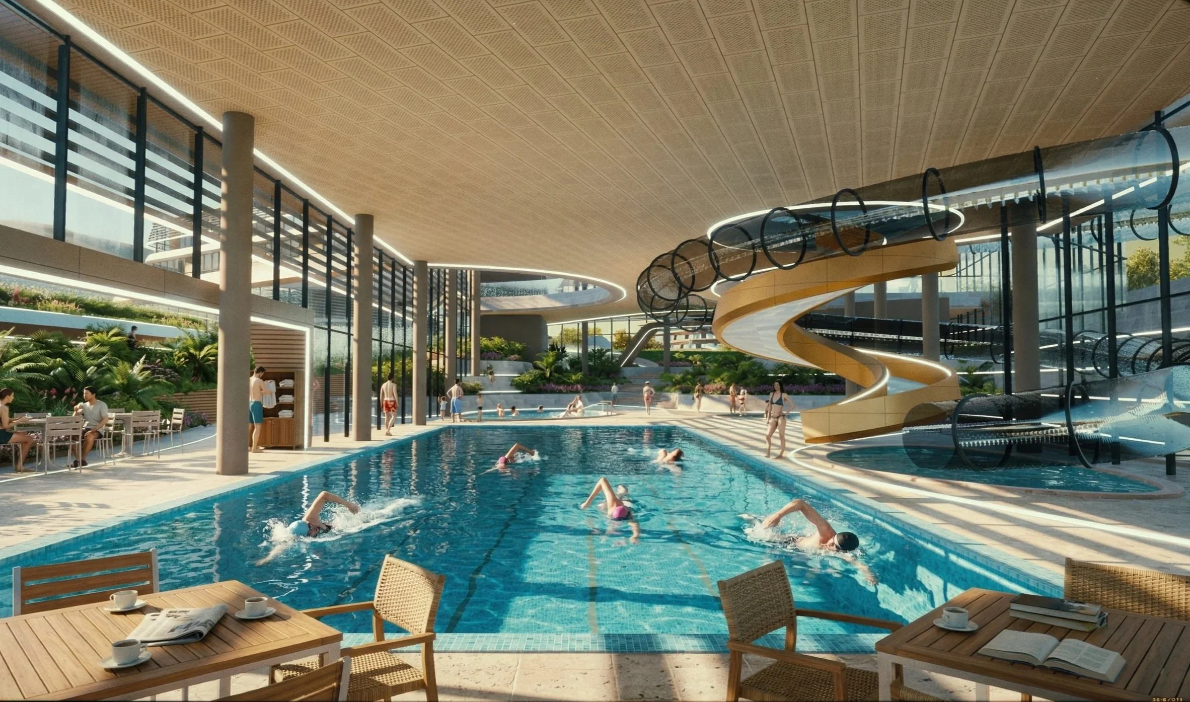 The multi-level family area is the biggest and most exciting spot for families and kids, stretching 140 meters long with nearly 900 m² of water surface. It offers a 25-meter swimming pool, a fun children’s slide tower, and two spacious outdoor areas.